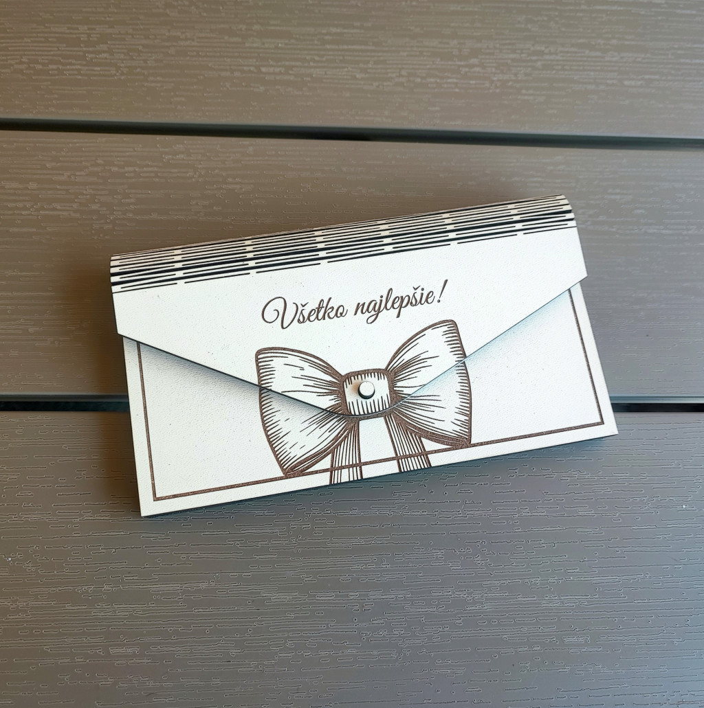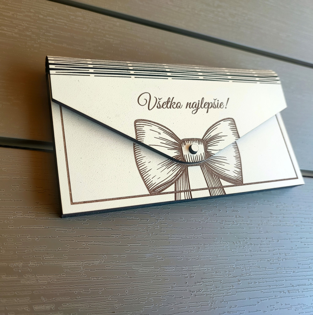 Táto drevená obálka na peniaze je krásnym a praktickým doplnkom ku každému daru. Vďaka kvalitnému spracovaniu a detailnému gravírovaniu pôsobí luxusne a výnimočne. Obálka je vhodná na rôzne príležitosti – narodeniny, svadby, výročia či oslavy. Peniaze alebo darčekový poukaz tak odovzdáte štýlovo a s nezabudnuteľným dojmom.