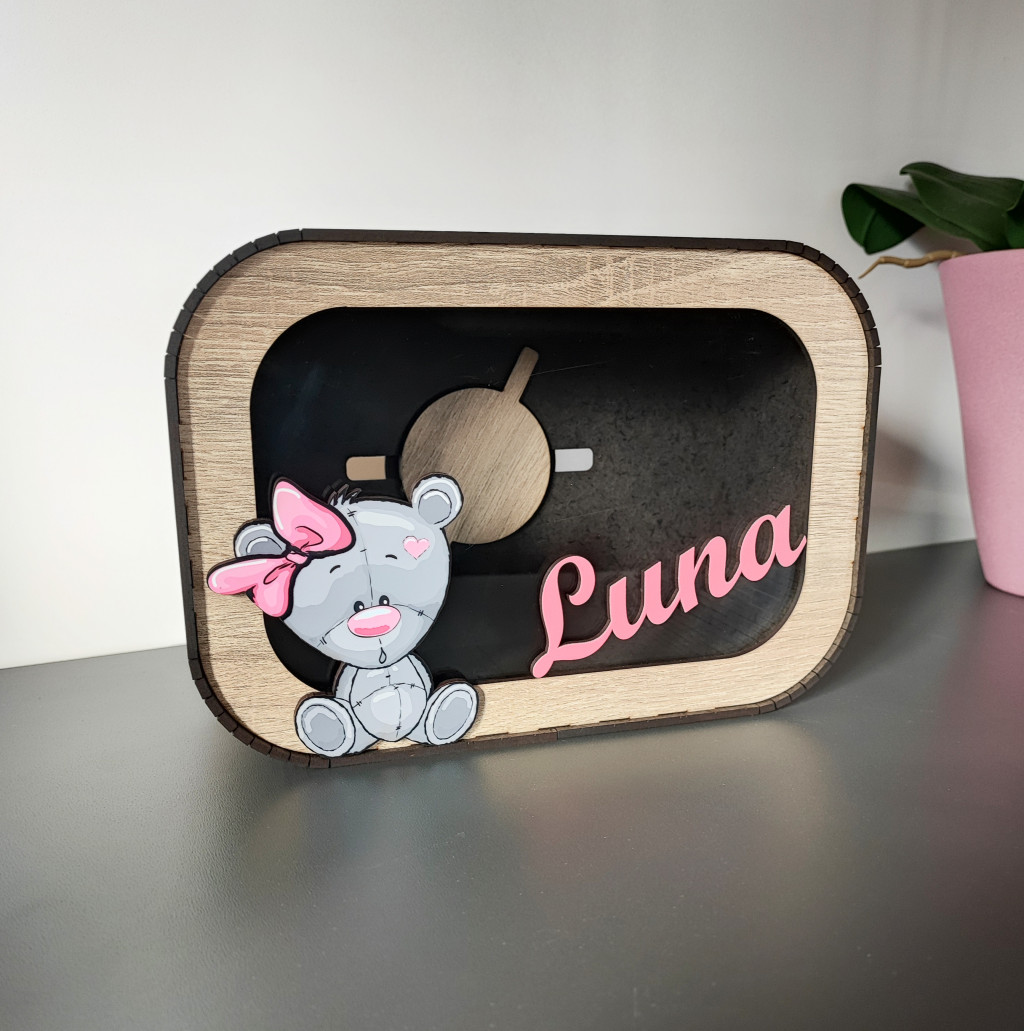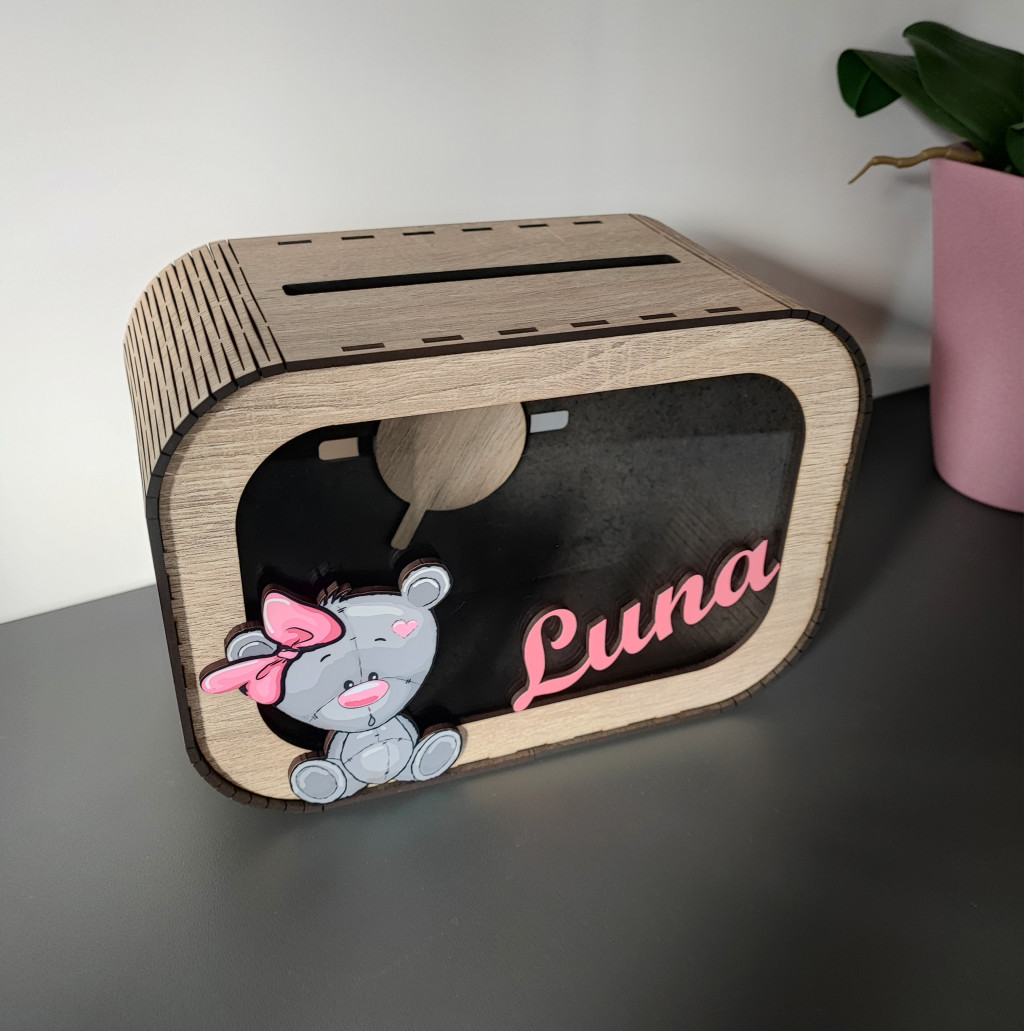 Jedinečná, menom gravírovaná drevená pokladnička s roztomilým motívom medvedíka. Perfektný darček pre deti na narodeniny, krstiny alebo akúkoľvek špeciálnu príležitosť. Predný plexi panel umožňuje vidieť nasporené peniaze, zozadu sa dá jednoducho vyprázdniť.