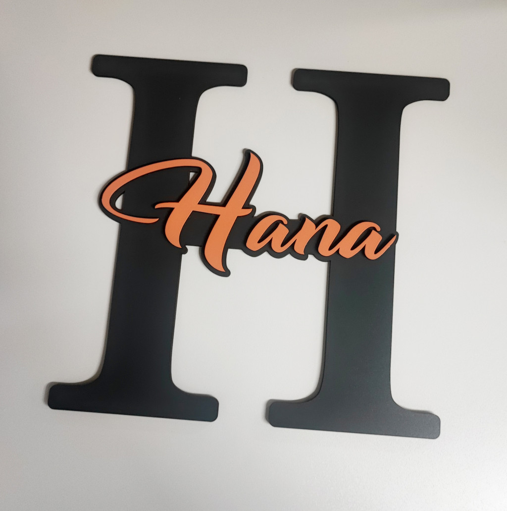 Štýlová drevená dekorácia na dvere pozostávajúca z dvoch vrstiev – veľké začiatočné písmeno a meno nalepené na ňom. Obidve vrstvy je možné prispôsobiť farebne podľa vlastného vkusu, vďaka čomu vzniká unikátna a osobná ozdoba do detskej izby, chodby či iného interiéru.