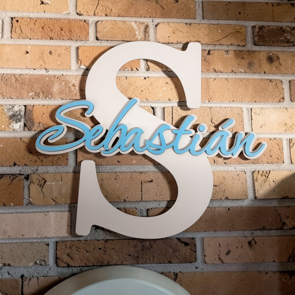 Štýlová drevená dekorácia na dvere pozostávajúca z dvoch vrstiev – veľké začiatočné písmeno a meno nalepené na ňom. Obidve vrstvy je možné prispôsobiť farebne podľa vlastného vkusu, vďaka čomu vzniká unikátna a osobná ozdoba do detskej izby, chodby či iného interiéru.