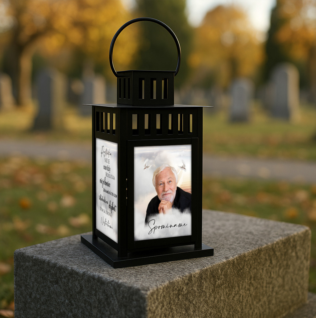 Elegantný čierny kovový lampáš s UV potlačeným sklom a dojemnou básňou, ktorá spomína na zosnulých blízkych. Ideálny ako hrobová dekorácia, na spomienkové miesta alebo do domáceho prostredia. Svetlo sviečky v lampáši vytvára pokojnú a dôstojnú atmosféru, zatiaľ čo text slúži ako večná spomienka.